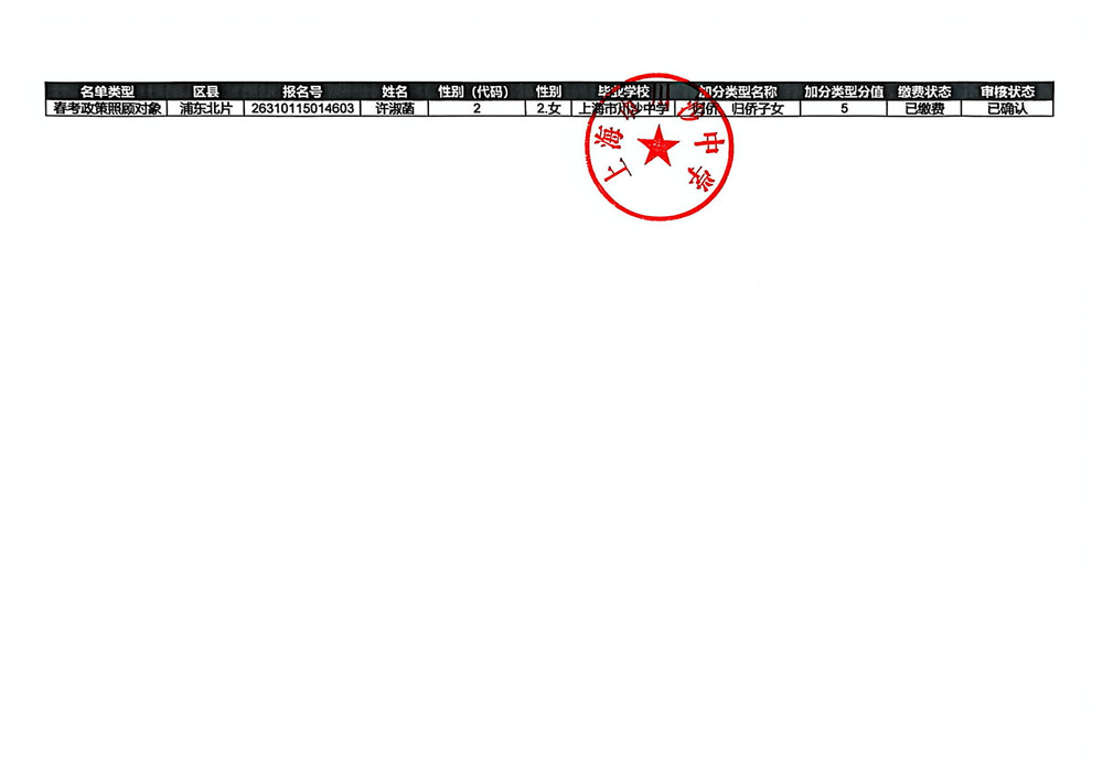 上海市2026年春季考试上海市川沙中学符合政策加分考生公示名单_1